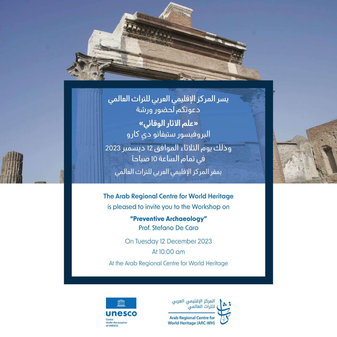 Le Centre régional arabe du patrimoine mondial (ARC-HW) a le plaisir de vous inviter au « Séminaire sur l’archéologie préventive » organisé par le Prof. Stefano De Caro, ancien Directeur général du Centre international d’études pour la conservation et la restauration des biens culturels (ICCROM) et ancien Directeur général de l’archéologie au ministère italien du Patrimoine.